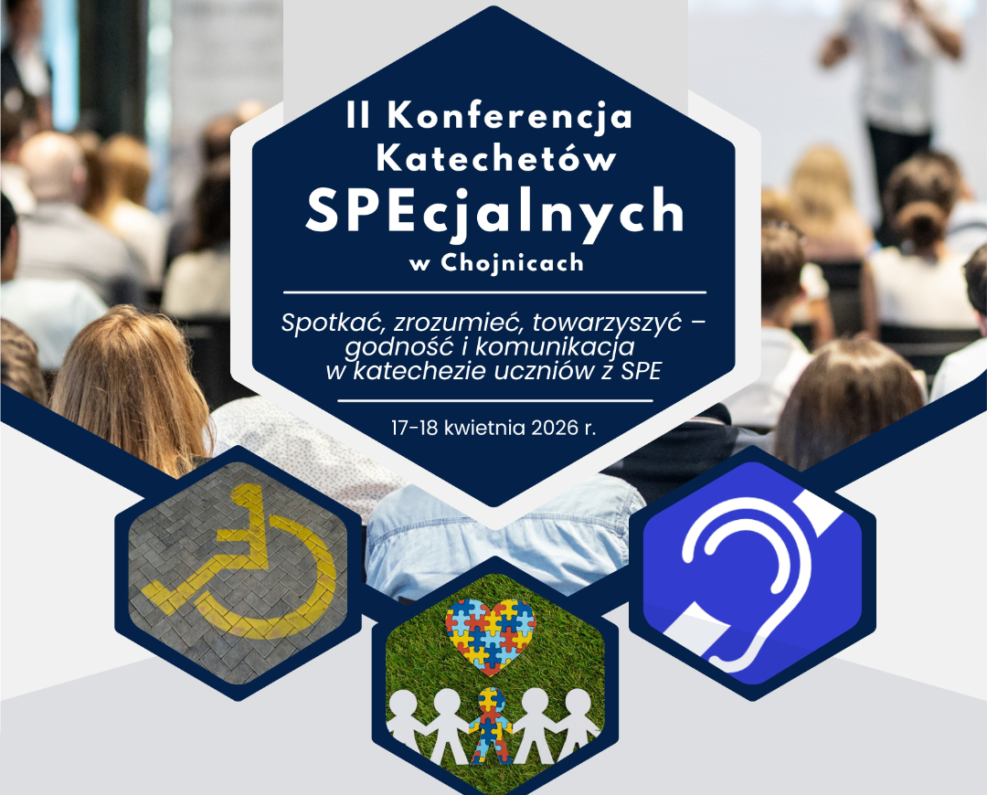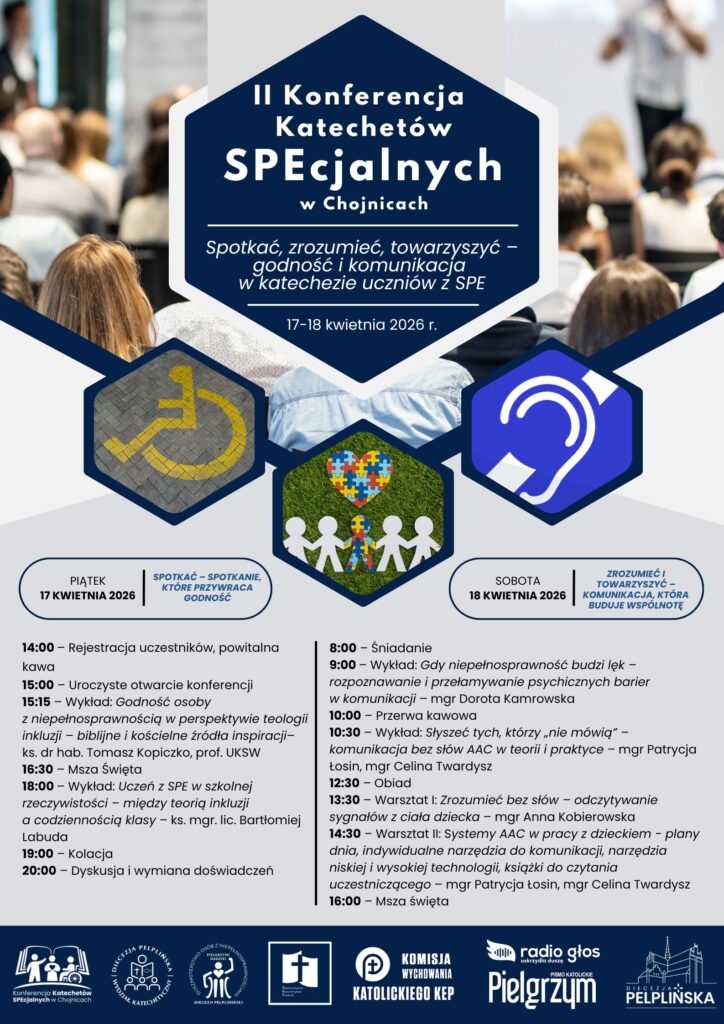 Katecheci specjalni z Chojnic, we współpracy z Wydziałem Katechetycznym oraz Duszpasterstwem Osób z Niepełnosprawnościami Diecezji Pelplińskiej, zapraszają do udziału w II Konferencji Katechetów SPEcjalnych w Chojnicach, która odbędzie się w dniach 17-18 kwietnia 2026 r.