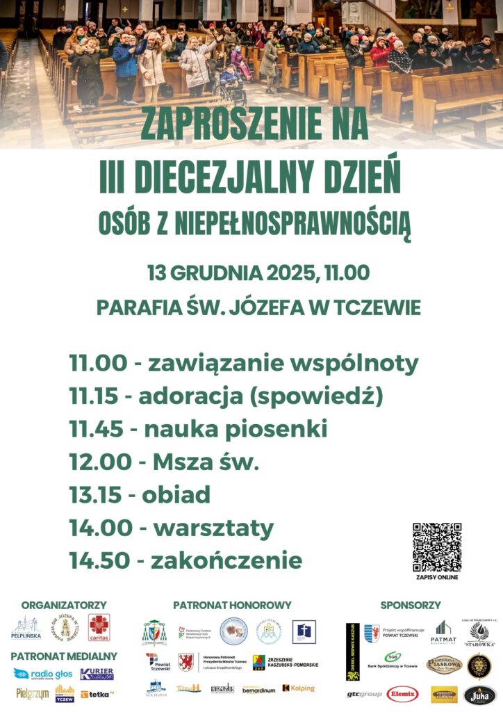 Parafia św. Józefa w Tczewie zaprasza duszpasterzy wraz z osobami z niepełnosprawnościami, ich rodzinami i opiekunami do udziału w III Diecezjalnym Dniu Osób z Niepełnosprawnością, który odbędzie się w sobotę 13 grudnia 2025 r.. Szczegółowy program podany jest na plakacie. Wydarzenie jest bezpłatne, jednak obowiązują zapisy online (kod QR na plakacie oraz za pośrednictwem: https://docs.google.com/forms/ ).