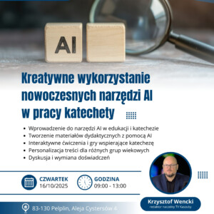 W czwartek, 16 października 2025 roku w Kociewskim Centrum Kultury w Pelplinie odbyły się warsztaty metodyczne zatytułowane „Kreatywne wykorzystanie nowoczesnych narzędzi AI w pracy katechety”. Spotkanie zostało zorganizowane przez Wydział Katechetyczny Diecezji Pelplińskiej, a prowadzącym był redaktor naczelny TV Kaszuby, pan Krzysztof Wencki. W wydarzeniu uczestniczyło 15 katechetów z terenu diecezji oraz klerycy Seminarium Duchownego w Pelplinie.