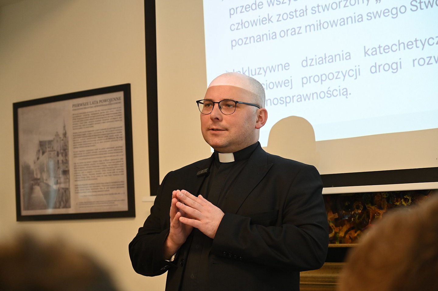 Spotkanie rozpoczęło się od wystąpienia ks. dra Łukasza Simińskiego – dyrektora Wydziału Katechetycznego Diecezji Pelplińskiej, który przybliżył perspektywę Kościoła wobec osób z niepełnosprawnościami. Podkreślił on, że „bycie razem w wierze” wymaga nie tylko otwartości serca, ale i zrozumienia specyfiki duchowości osób, które postrzegają świat w sposób niestandardowy.
