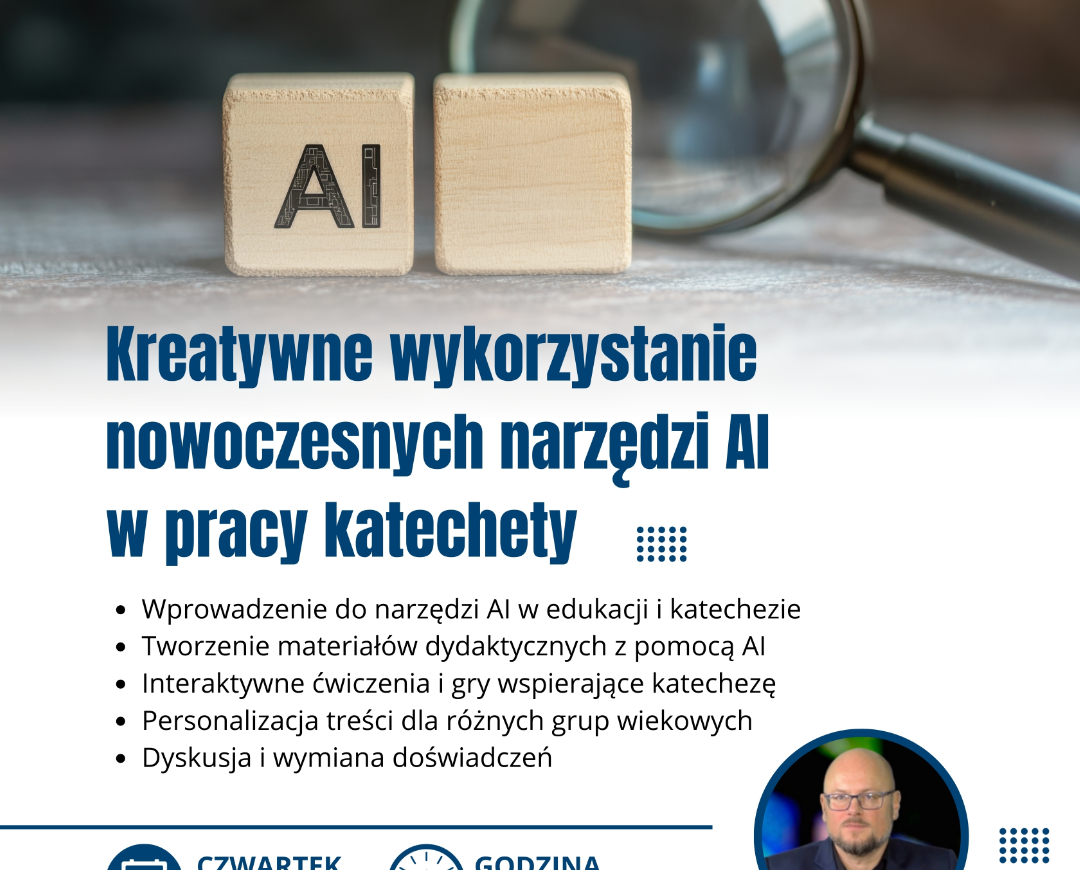 Wydział Katechetyczny zaprasza do wspólnego odkrywania, jak kreatywnie i odpowiedzialnie korzystać z nowoczesnych technologii w służbie katechezy. Warsztaty metodyczne będą okazją do odkrycia, jak nowoczesne narzędzia sztucznej inteligencji mogą wspierać i uatrakcyjniać pracę katechetyczną. Spotkanie pozwoli zdobyć praktyczne umiejętności, poznać inspirujące przykłady oraz wymienić się doświadczeniami.