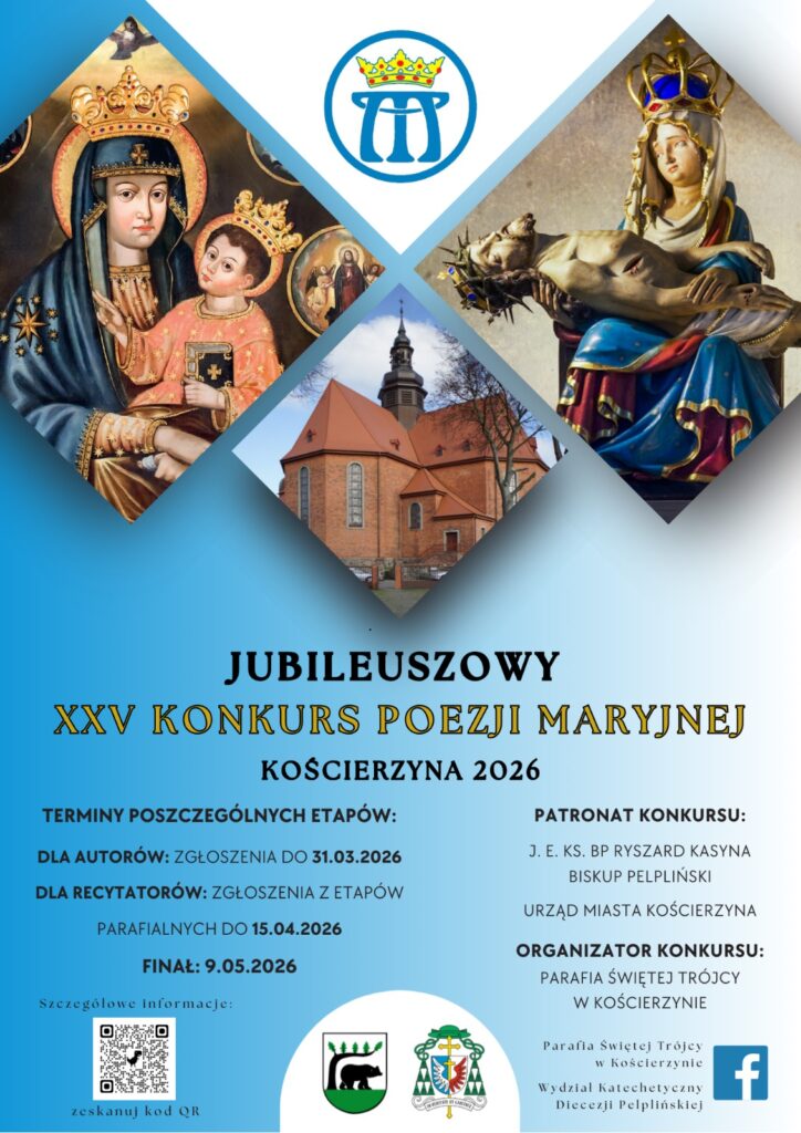 Parafia Świętej Trójcy w Kościerzynie serdecznie zaprasza wszystkie szkoły i parafie diecezji pelplińskiej do wzięcia udziału w „XXV Konkursie Poezji Maryjnej – 2026 r.”